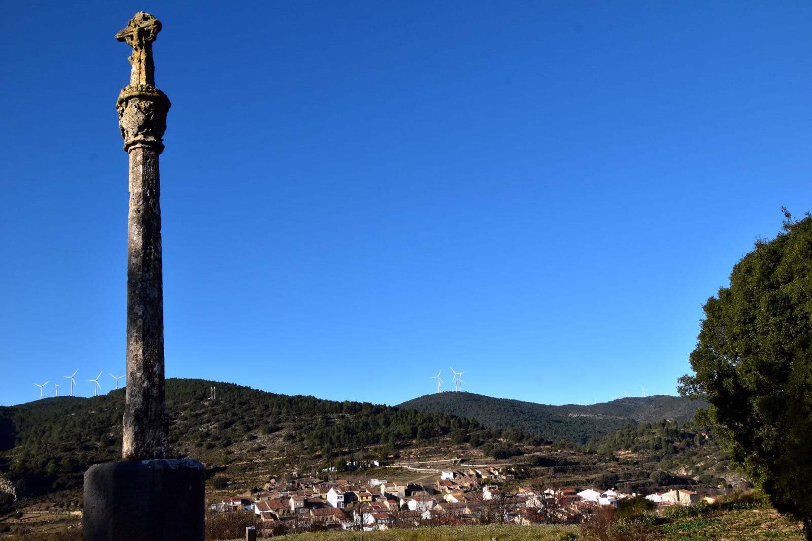 Seguim ara l’ampla pista dels molins de vent (NE) i en una cruïlla agafem a la dreta un ramal que baixa en diagonal el vessant sobre la foia de la Pobleta i el poble d’Andilla que guaitem sota les ennegrides muntanyes de Peñaparda. En una nova cruïlla girem a l’esquerra per una drecera que baixa al corral de la Ubiela.